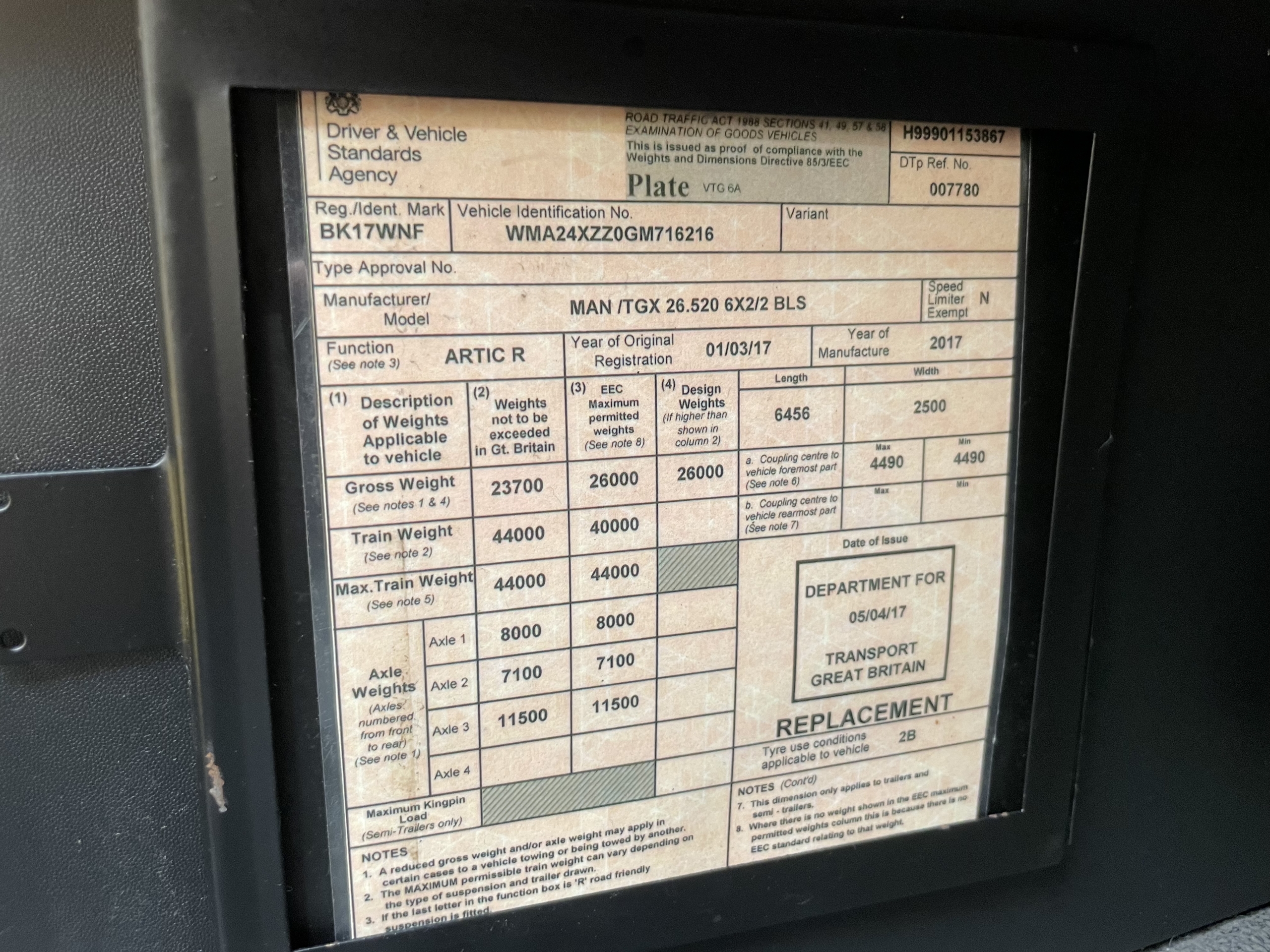 MAN TGX 26.520 *EURO 6* XXL 6X2 TRACTOR UNIT – 2017 – BK17 WNF