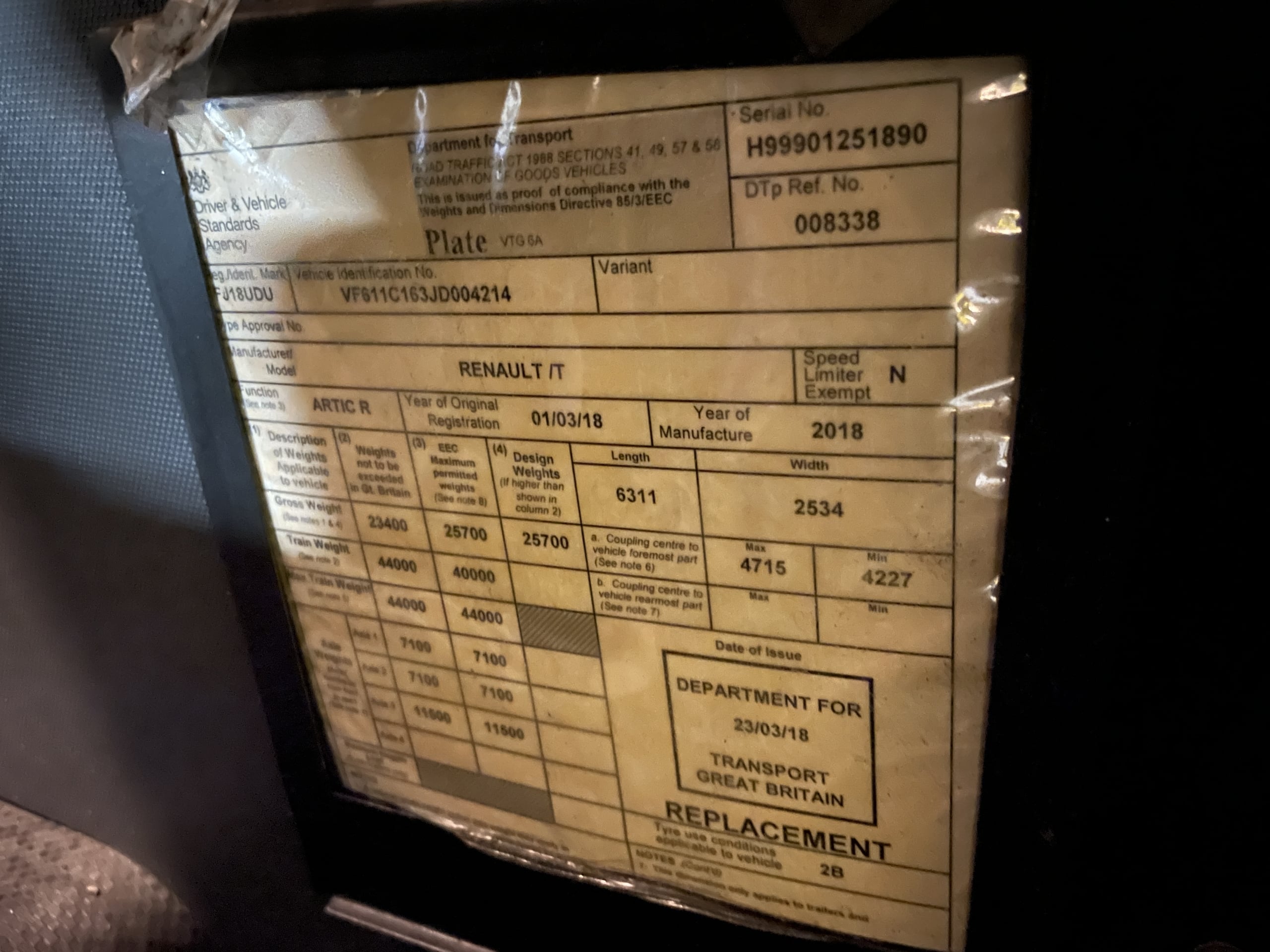 RENAULT T460 COMFORT *EURO 6* 6X2 TRACTOR UNIT – 2018 – FJ18 UDU